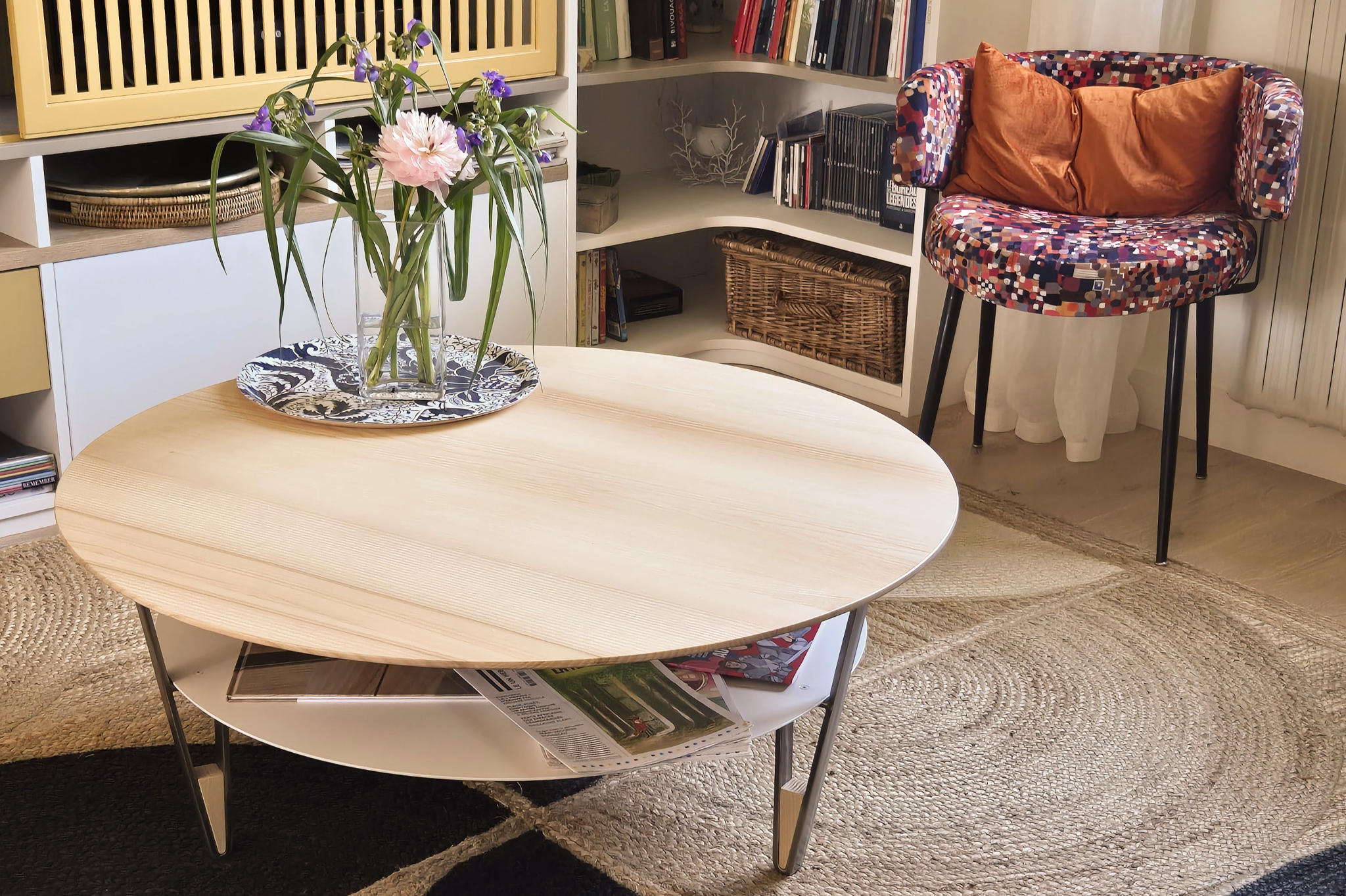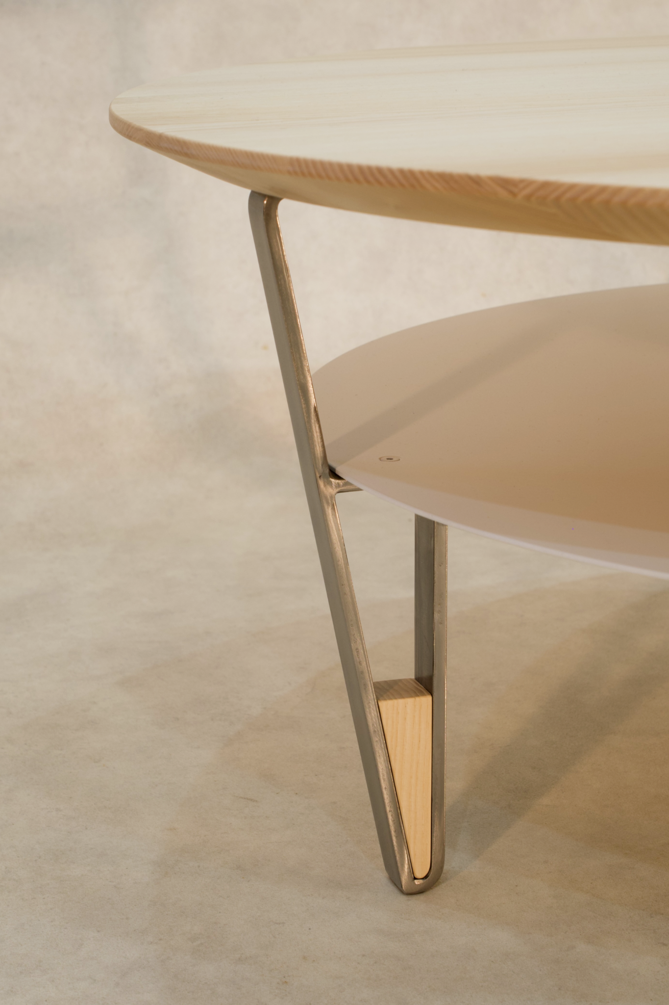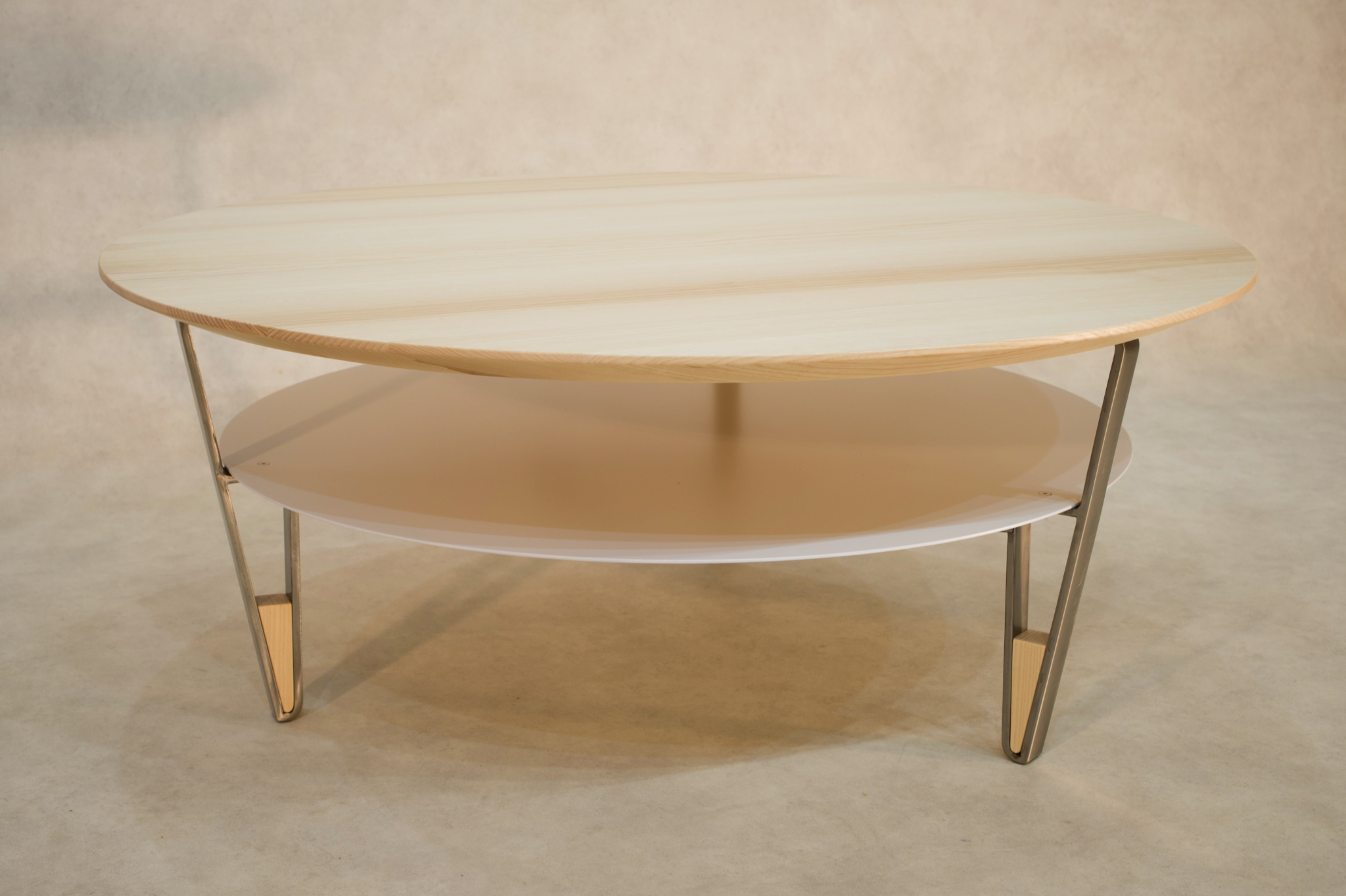 Blanche s’inspire de la table basse Ovale. Son plateau repose également sur un piétement incliné en fer plat avec l’incrustation d’une petite pièce en frêne.