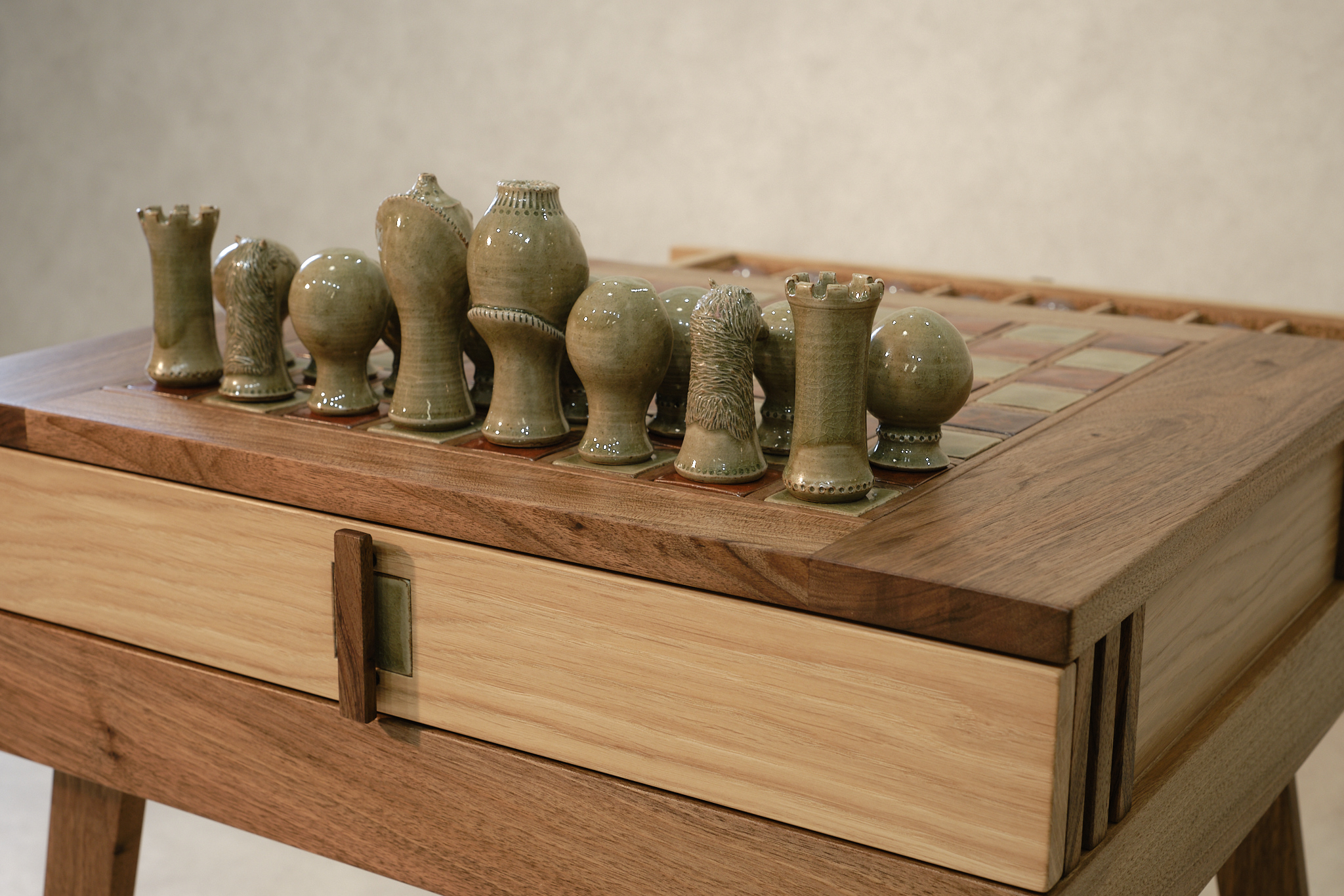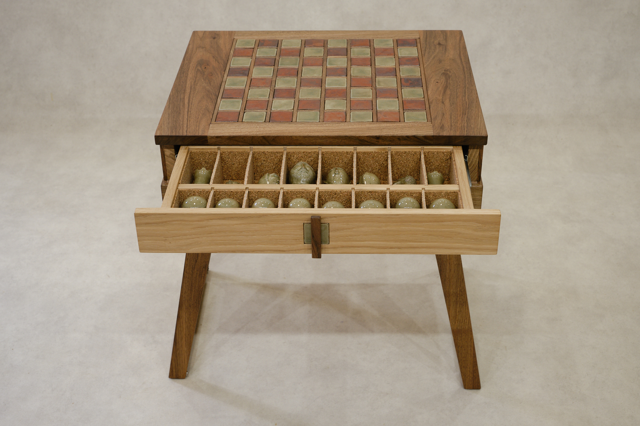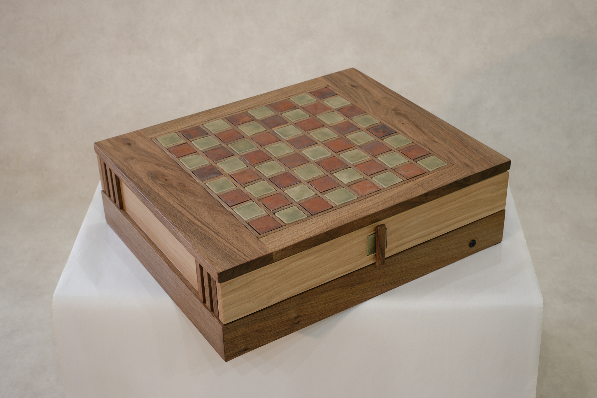 Un travail de marqueterie en noyer accueille le damier, et met en valeurs ses couleurs verte et terracotta. La boite joue, elle aussi, sur deux essences opposées, le noyer et le chêne.